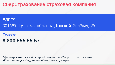 СберСтрахование, страховая компания по адресу 301699, Тульская область, Донской, Зелёная, 25 в дальнейшем Организация, размещена в следующих категориях: