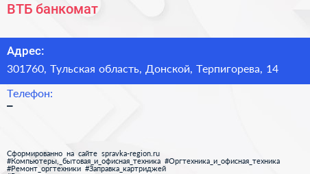 ВТБ, банкомат по адресу 301760, Тульская область, Донской, Терпигорева, 14 в дальнейшем Организация, размещена в следующих категориях: