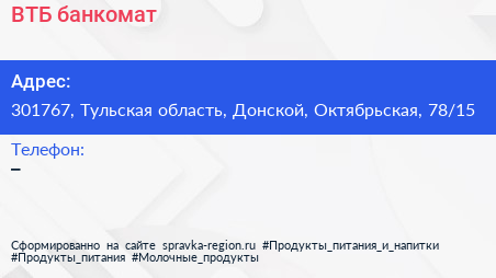 ВТБ, банкомат по адресу 301767, Тульская область, Донской, Октябрьская, 78/15 в дальнейшем Организация, размещена в следующих категориях: