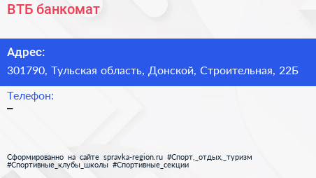 ВТБ, банкомат по адресу 301790, Тульская область, Донской, Строительная, 22Б в дальнейшем Организация, размещена в следующих категориях: