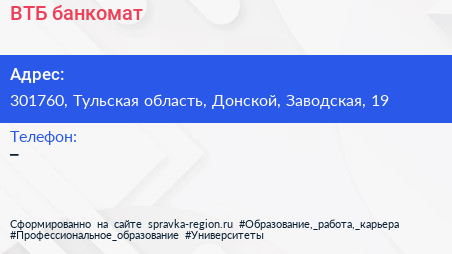 ВТБ, банкомат по адресу 301760, Тульская область, Донской, Заводская, 19 в дальнейшем Организация, размещена в следующих категориях: