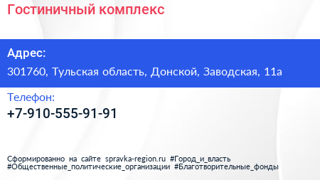 Гостиничный комплекс по адресу 301760, Тульская область, Донской, Заводская, 11а в дальнейшем Организация, размещена в следующих категориях: