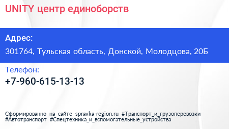 UNITY, центр единоборств по адресу 301764, Тульская область, Донской, Молодцова, 20Б в дальнейшем Организация, размещена в следующих категориях: