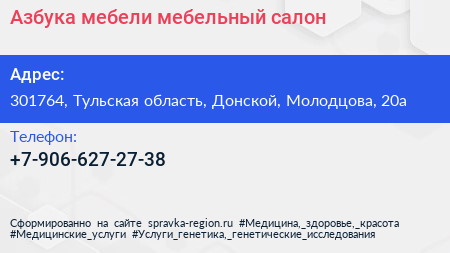 Азбука мебели, мебельный салон по адресу 301764, Тульская область, Донской, Молодцова, 20а в дальнейшем Организация, размещена в следующих категориях: