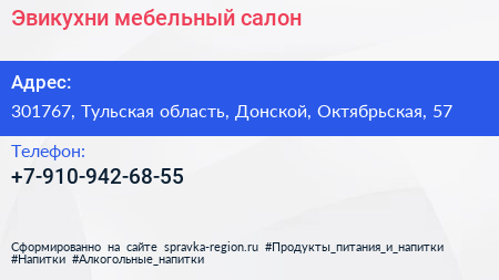 Эвикухни, мебельный салон по адресу 301767, Тульская область, Донской, Октябрьская, 57 в дальнейшем Организация, размещена в следующих категориях: