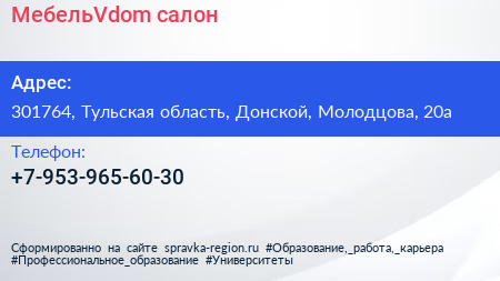 МебельVdom, салон по адресу 301764, Тульская область, Донской, Молодцова, 20а в дальнейшем Организация, размещена в следующих категориях:
