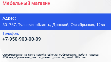 Мебельный магазин по адресу 301767, Тульская область, Донской, Октябрьская, 126в в дальнейшем Организация, размещена в следующих категориях: