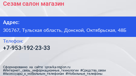 Сезам, салон-магазин по адресу 301767, Тульская область, Донской, Октябрьская, 48Б в дальнейшем Организация, размещена в следующих категориях: