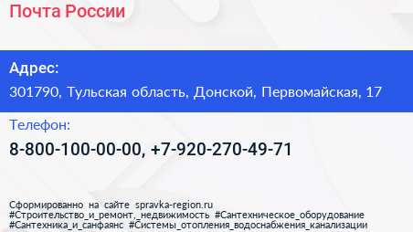 Почта России по адресу 301790, Тульская область, Донской, Первомайская, 17 в дальнейшем Организация, размещена в следующих категориях: