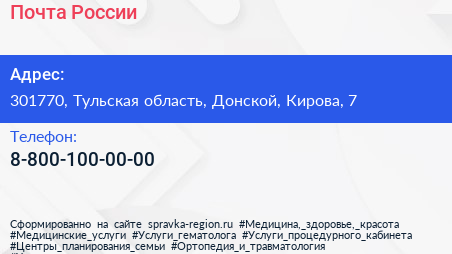 Почта России по адресу 301770, Тульская область, Донской, Кирова, 7 в дальнейшем Организация, размещена в следующих категориях: