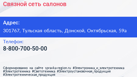Связной, сеть салонов по адресу 301767, Тульская область, Донской, Октябрьская, 59а в дальнейшем Организация, размещена в следующих категориях: