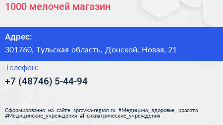 1000 мелочей, магазин по адресу 301760, Тульская область, Донской, Новая, 21 в дальнейшем Организация, размещена в следующих категориях: