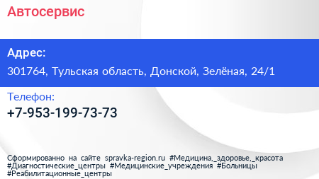 Автосервис по адресу 301764, Тульская область, Донской, Зелёная, 24/1 в дальнейшем Организация, размещена в следующих категориях: