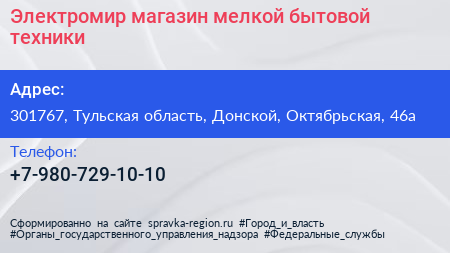 Электромир, магазин мелкой бытовой техники по адресу 301767, Тульская область, Донской, Октябрьская, 46а в дальнейшем Организация, размещена в следующих категориях: