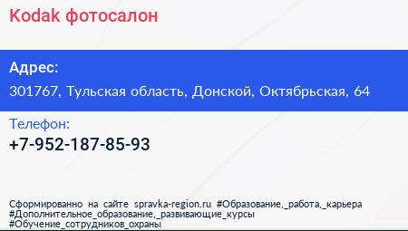 Kodak, фотосалон по адресу 301767, Тульская область, Донской, Октябрьская, 64 в дальнейшем Организация, размещена в следующих категориях:
