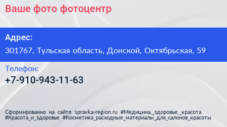 Ваше фото, фотоцентр по адресу 301767, Тульская область, Донской, Октябрьская, 59 в дальнейшем Организация, размещена в следующих категориях: