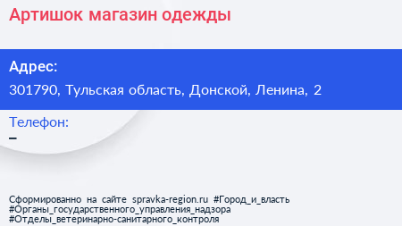 Артишок, магазин одежды по адресу 301790, Тульская область, Донской, Ленина, 2 в дальнейшем Организация, размещена в следующих категориях: