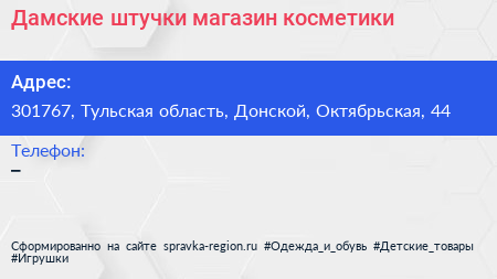 Дамские штучки, магазин косметики по адресу 301767, Тульская область, Донской, Октябрьская, 44 в дальнейшем Организация, размещена в следующих категориях: