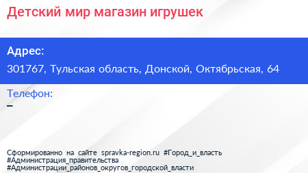 Детский мир, магазин игрушек по адресу 301767, Тульская область, Донской, Октябрьская, 64 в дальнейшем Организация, размещена в следующих категориях: