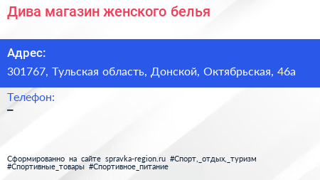 Дива, магазин женского белья по адресу 301767, Тульская область, Донской, Октябрьская, 46а в дальнейшем Организация, размещена в следующих категориях: