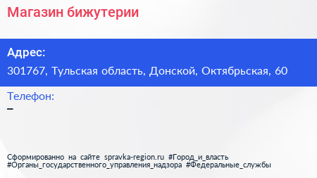 Магазин бижутерии по адресу 301767, Тульская область, Донской, Октябрьская, 60 в дальнейшем Организация, размещена в следующих категориях: