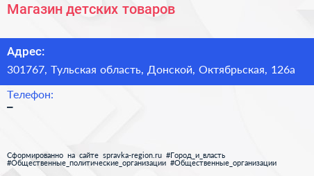 Магазин детских товаров по адресу 301767, Тульская область, Донской, Октябрьская, 126а в дальнейшем Организация, размещена в следующих категориях: