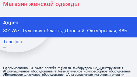 Магазин женской одежды по адресу 301767, Тульская область, Донской, Октябрьская, 48Б в дальнейшем Организация, размещена в следующих категориях: