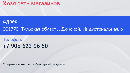 Хозя, сеть магазинов по адресу 301770, Тульская область, Донской, Индустриальная, 6 в дальнейшем Организация, размещена в следующих категориях:
