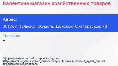 Валентина, магазин хозяйственных товаров по адресу 301767, Тульская область, Донской, Октябрьская, 73 в дальнейшем Организация, размещена в следующих категориях: