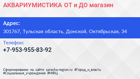 АКВАРИУМИСТИКА ОТ и ДО, магазин по адресу 301767, Тульская область, Донской, Октябрьская, 34 в дальнейшем Организация, размещена в следующих категориях: