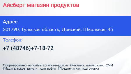 Айсберг, магазин продуктов по адресу 301790, Тульская область, Донской, Школьная, 45 в дальнейшем Организация, размещена в следующих категориях: