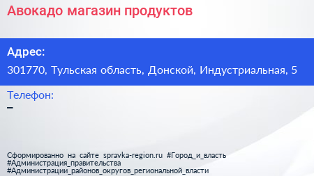Авокадо, магазин продуктов по адресу 301770, Тульская область, Донской, Индустриальная, 5 в дальнейшем Организация, размещена в следующих категориях:
