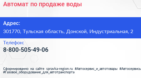 Автомат по продаже воды по адресу 301770, Тульская область, Донской, Индустриальная, 2 в дальнейшем Организация, размещена в следующих категориях: