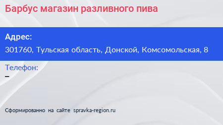 Барбус, магазин разливного пива по адресу 301760, Тульская область, Донской, Комсомольская, 8 в дальнейшем Организация, размещена в следующих категориях: