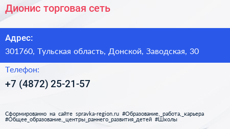 Дионис, торговая сеть по адресу 301760, Тульская область, Донской, Заводская, 30 в дальнейшем Организация, размещена в следующих категориях: