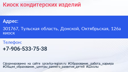 Киоск кондитерских изделий по адресу 301767, Тульская область, Донской, Октябрьская, 126а киоск в дальнейшем Организация, размещена в следующих категориях: