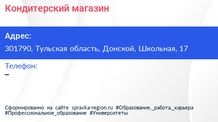 Кондитерский магазин по адресу 301790, Тульская область, Донской, Школьная, 17 в дальнейшем Организация, размещена в следующих категориях: