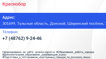 Краснобор по адресу 301699, Тульская область, Донской, Ширинский посёлок, 1 в дальнейшем Организация, размещена в следующих категориях:
