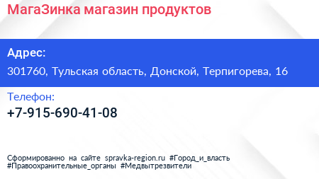 МагаЗинка, магазин продуктов по адресу 301760, Тульская область, Донской, Терпигорева, 16 в дальнейшем Организация, размещена в следующих категориях: