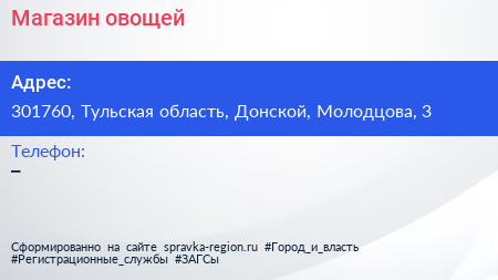 Магазин овощей по адресу 301760, Тульская область, Донской, Молодцова, 3 в дальнейшем Организация, размещена в следующих категориях:
