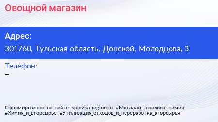 Овощной магазин по адресу 301760, Тульская область, Донской, Молодцова, 3 в дальнейшем Организация, размещена в следующих категориях: