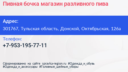 Пивная бочка, магазин разливного пива по адресу 301767, Тульская область, Донской, Октябрьская, 126а в дальнейшем Организация, размещена в следующих категориях: