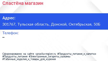 Сластёна, магазин по адресу 301767, Тульская область, Донской, Октябрьская, 50Б в дальнейшем Организация, размещена в следующих категориях: