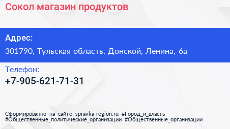 Сокол, магазин продуктов по адресу 301790, Тульская область, Донской, Ленина, 6а в дальнейшем Организация, размещена в следующих категориях: