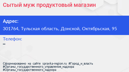 Сытый муж, продуктовый магазин по адресу 301764, Тульская область, Донской, Октябрьская, 95 в дальнейшем Организация, размещена в следующих категориях: