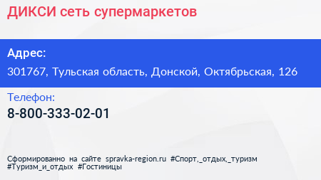 ДИКСИ, сеть супермаркетов по адресу 301767, Тульская область, Донской, Октябрьская, 126 в дальнейшем Организация, размещена в следующих категориях: