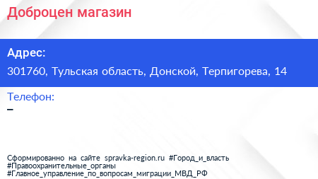 Доброцен, магазин по адресу 301760, Тульская область, Донской, Терпигорева, 14 в дальнейшем Организация, размещена в следующих категориях: