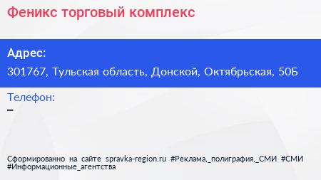 Феникс, торговый комплекс по адресу 301767, Тульская область, Донской, Октябрьская, 50Б в дальнейшем Организация, размещена в следующих категориях:
