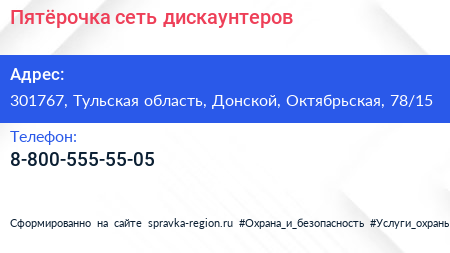 Пятёрочка, сеть дискаунтеров по адресу 301767, Тульская область, Донской, Октябрьская, 78/15 в дальнейшем Организация, размещена в следующих категориях: