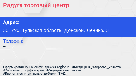 Радуга, торговый центр по адресу 301790, Тульская область, Донской, Ленина, 3 в дальнейшем Организация, размещена в следующих категориях: